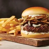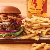 Savor the rich flavor in this tasty original. An all-beef patty topped with two slices of Pepper Jack cheese, crispy onions, two strips of Applewood-smoked bacon and Fireball® Whisky-infused steak sauce. Served with lettuce, tomato, onion and pickles on a Brioche bun. Served with classic fries.