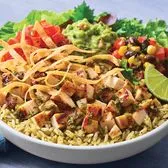Grilled chipotle lime chicken on fresh greens and cilantro rice with house-made pico de gallo, black bean corn salsa and guacamole. Topped with chimichurri, tortilla strips and a fresh lime wedge.