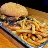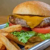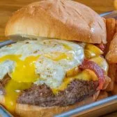 Two Grilled to order half pound Angus Burgers topped with aged Cheddar Cheese and Bacon and served on a toasted Brioche Bun