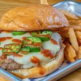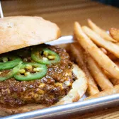 Texas Sized Burger topped with Cheese, Chili and Jalapeno slices.
