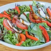 Spring Greens topped with fresh Buffalo Mozzarella, Tomatoes, and a drizzle of Balsamic Glaze and Roasted Red Peppers for garnish