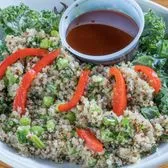 Fresh Kale, Mixed Quinoa, Edamame, Roasted Red Peppers, served with Red Wine Vinaigrette on the side.