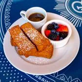 French toast sticks with a side of warm maple syrup and a side of fruit