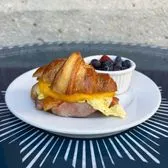 scrambled egg, ham, & cheddar on a mini croissant, served with fruit