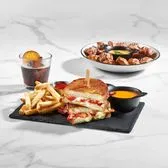 garlic butter, white cheddar, mozzarella, provolone, roasted grape tomatoes, applewood smoked bacon, toasted sourdough, tomato basil soup dipper