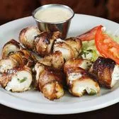 Bacon-wrapped cream cheese & jalapeño-stuffed chicken breast, Cajun cream sauce.