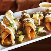 Boudin-stuffed floutas, cotija cheese, avocado, salsa verde, queso.