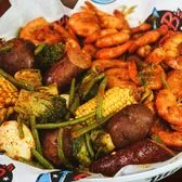 2 LB boiled shrimp, 2 corn, 4 potatoes, pineapple sausage, garlic sausage, monsta greens, butter, dipping sauce.