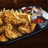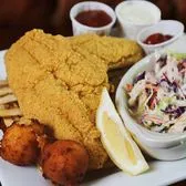 US farm-raised fried catfish. Served with fries, hush puppies, and coleslaw.