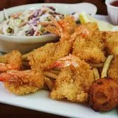 Gulf Coast fried shrimp. Served with fries, hush puppies, and coleslaw.