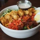 Fried chicken, mixed greens, bacon, sharp cheddar, cucumbers, egg, tomato