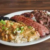 A combination of Red Beans and Rice, Crawfish Etouffee and a Garlic Smoked Sausage Link.