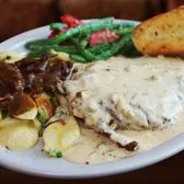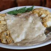 Topped in country white gravy. Served with garlic mashed potatoes, choice of one side.