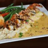 Jumbo blackened shrimp sautéed in a zesty andouille cream sauce with celery, onions, bell peppers and garlic. Served over a bed of cheese grits, choice of one side.