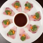 Thinly sliced salmon and fresh avocado served in a lime soy sauce