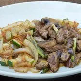 Teriyaki steak* with green onions and mushrooms grilled in a homemade teriyaki sauce.