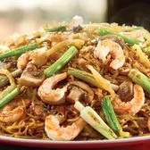 Japanese sautéed noodles with shrimp and mixed vegetables in a special sauce and sprinkled with sesame seeds.