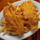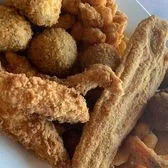 Our Seafood platter & fried chicken tenders, boudin balls, hush puppies with choice of side
