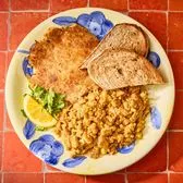 Our House Tofu Scramble tossed with our Fire sauce puree, Tortilla chips, Zucchini, Onion, & Spices served with Salsa and your choice of Tortillas with your choice of Refried Black Beans, House Red and Black Beans, or Field Greens with Vinaigrette.