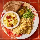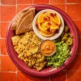 House tofu scramble, herbed potato hash cake, spicy refried or house beans, avocado, cheddar jack or vegan cheese, diced tomatoes, shredded lettuce, house salsa and choice of tortillas.