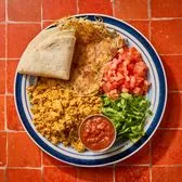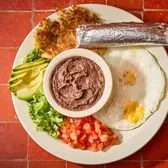 Scrambled Pasture Raised Eggs, Herbed Potato Hash Cake, Spicy Refried or House Beans, Avocado, Cheddar Jack or Vegan Cheddar Cheese, Diced Tomatoes, Shredded Lettuce, House Salsa and choice of Tortillas.