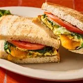 Big Egg Breakfast Sandwich made with Scrambled Pasture Raised Eggs, Cheddar-Jack Cheese, Chili Flake, Spinach, Tomatoes, and Basil Aioli on Grilled Sourdough.