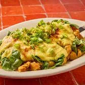 Pasture raised Texas eggs scrambled with our House Fire Sauce Puree, Tortilla Chips, Zucchini, Onion, Garlic, Cheddar-Jack Cheese, & Spices. Served with Salsa and your choice of Tortillas. Your choice of Refried Black Beans, House Red and Black Beans, or Field Greens and Vinaigrette.