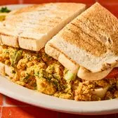 Big breakfast sandwich made with house tofu scramble, chili Flakes, spinach, local tomatoes, vegan or dairy cheese and basil aioli on grilled sourdough.