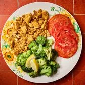 Our house Tofu Scramble with Sliced Local Tomatoes and Steamed Organic Baby Spinach. (GF)