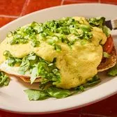Two Over-medium Eggs served over Local Tomatoes, Tofu Bacon, and Grilled Ciabatta. Topped with Spinach, Scallions, and our House-made Vegan Hollandaise (contains flour).