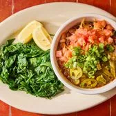 Organic Black and Pinto Beans Slow cooked with House seasonings, poured over Organic Brown Rice & topped with Pickled Jalapeños, Fresh Tomatoes, and Scallions. (GF)