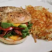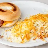 1 egg with choice of ham, bacon or sausage & American cheese, on a toasted bagel, served grilled with a side of hash browns