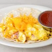 Diced ham paired with scrambled eggs and melted cheese in a warm tortilla — a balanced breakfast classic.
