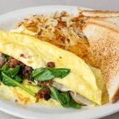 Spinach, bacon, mushrooms & Swiss cheese, hash browns & your choice of toast