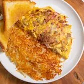 Bacon, sausage, ham & cheddar cheese, hash browns & your choice of toast