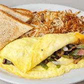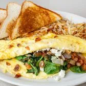 Onions, spinach, tomatoes & feta cheese, hash browns & your choice of toast