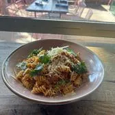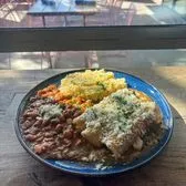 rice pilaf, borracho beans, queso fresco, chicken, shrimp, pork