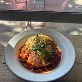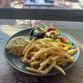 marinated flank steak, tomato, onion, rice pilaf, frites