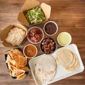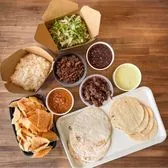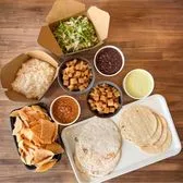Yummy food for 3 - 4 people with your choice of 2 proteins, fluffy jasmine rice, tasty black beans, crunchy lettuce mix, house-made verde ranch and salsa, 4 corn tortillas, 4 flour tortillas, and a side of crispy chips for a delightful dining experience.