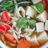 Fresh vegetables, noodles, and steamed tofu served in a warm vegetable broth