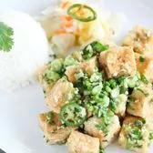 Crispy fried tofu tossed with green onions, garlic, and jalapeños in butter, served with pickled vegetables and rice