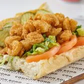 crispy shrimp, cajun aioli, shredded romaine lettuce, pickles, tomatoes, french bread