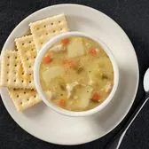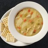 Homestyle dumplins with shredded chicken, celery, carrots, and onions in a savory broth.