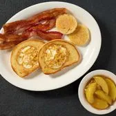 Pancakes with pecans, with 100% pure natural syrup. Served with scrambled eggs, choice of breakfast meat, and hashbrown casserole or fried apples.