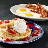 Two buttermilk pancakes topped with fresh strawberries. Includes two eggs*, choice of breakfast meat and 100% pure natural syrup.