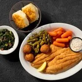 Two cornmeal-fried U.S. farm-raised catfish fillets with tartar sauce and hushpuppies. Served with two or three classic sides and buttermilk biscuits or corn muffins.