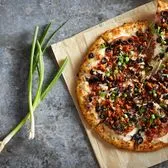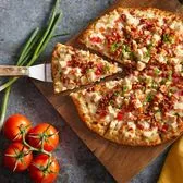 White Sauce, Cheese, Chicken, Bacon, Diced Tomatoes and Green Onions.