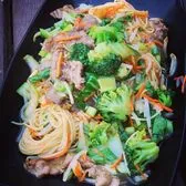 Egg noodles stir-fried in a sweet chili sauce with Asian vegetable medley.