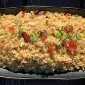Fried rice with delicious pork sausage, bell peppers, onions, lemon basil, and your choice of chicken or +$2 for shrimp. Vegetarian option available. Add an egg for $1.50!