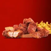 White meat chicken tender bites served with a side of fries, a slice of bread, pickles, and side of Dave's sauce.